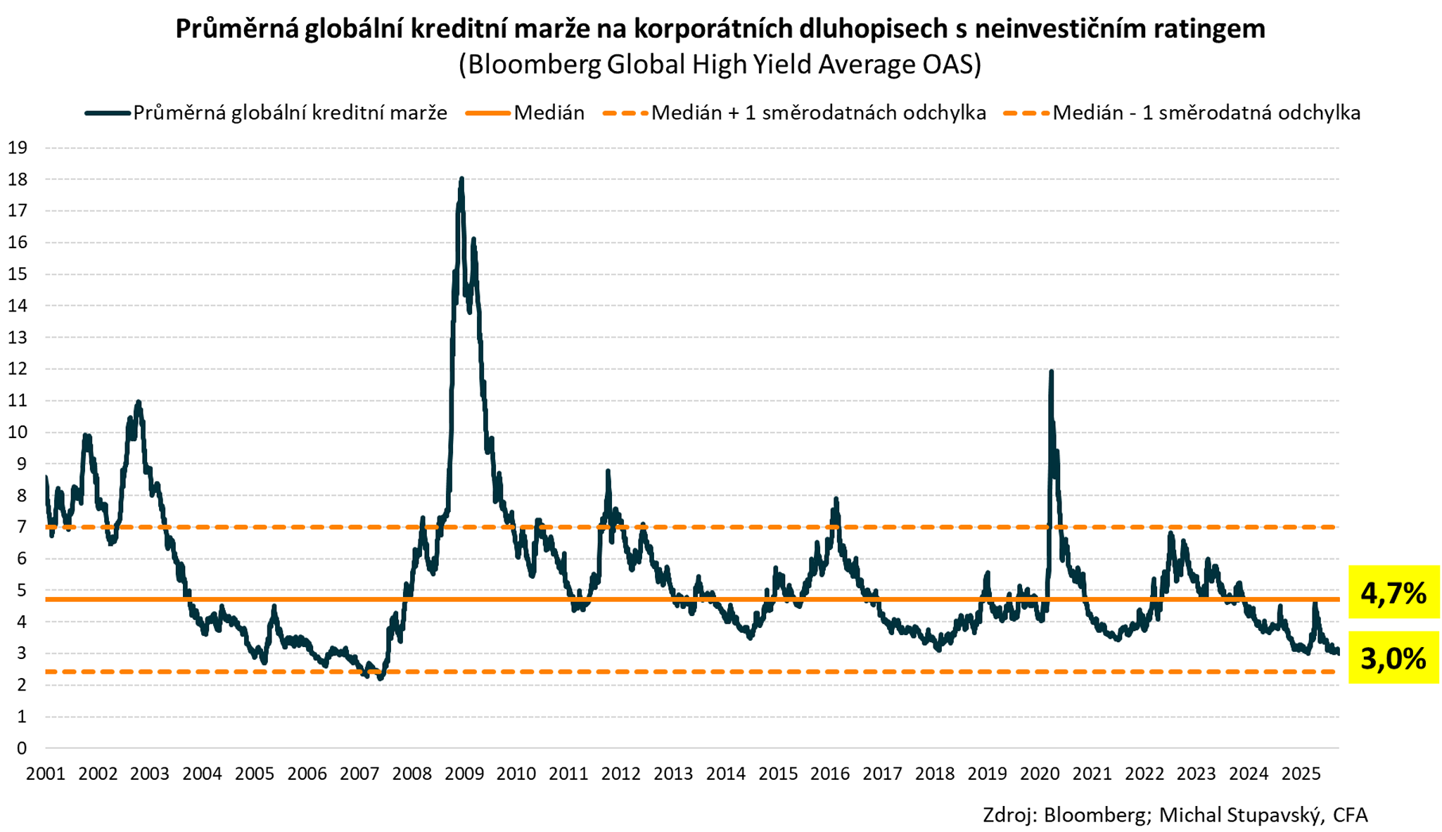 Optimismus je patrný i na dluhopisovém trhu, kde jsou ceny rovněž hnané hladem investorů za vysokými výnosy. Svědčí o tom velmi nízké kreditní spready high-yield dluhopisů. Ty poklesly na úrovně okolo 3 % a jsou nejnižší od období před finanční krizí. Samotné výnosy rizikových firemních dluhopisů jsou sice stále poměrně atraktivní (průměrně 6,7 % do splatnosti), nicméně prémie oproti státním dluhopisům jsou stlačené.