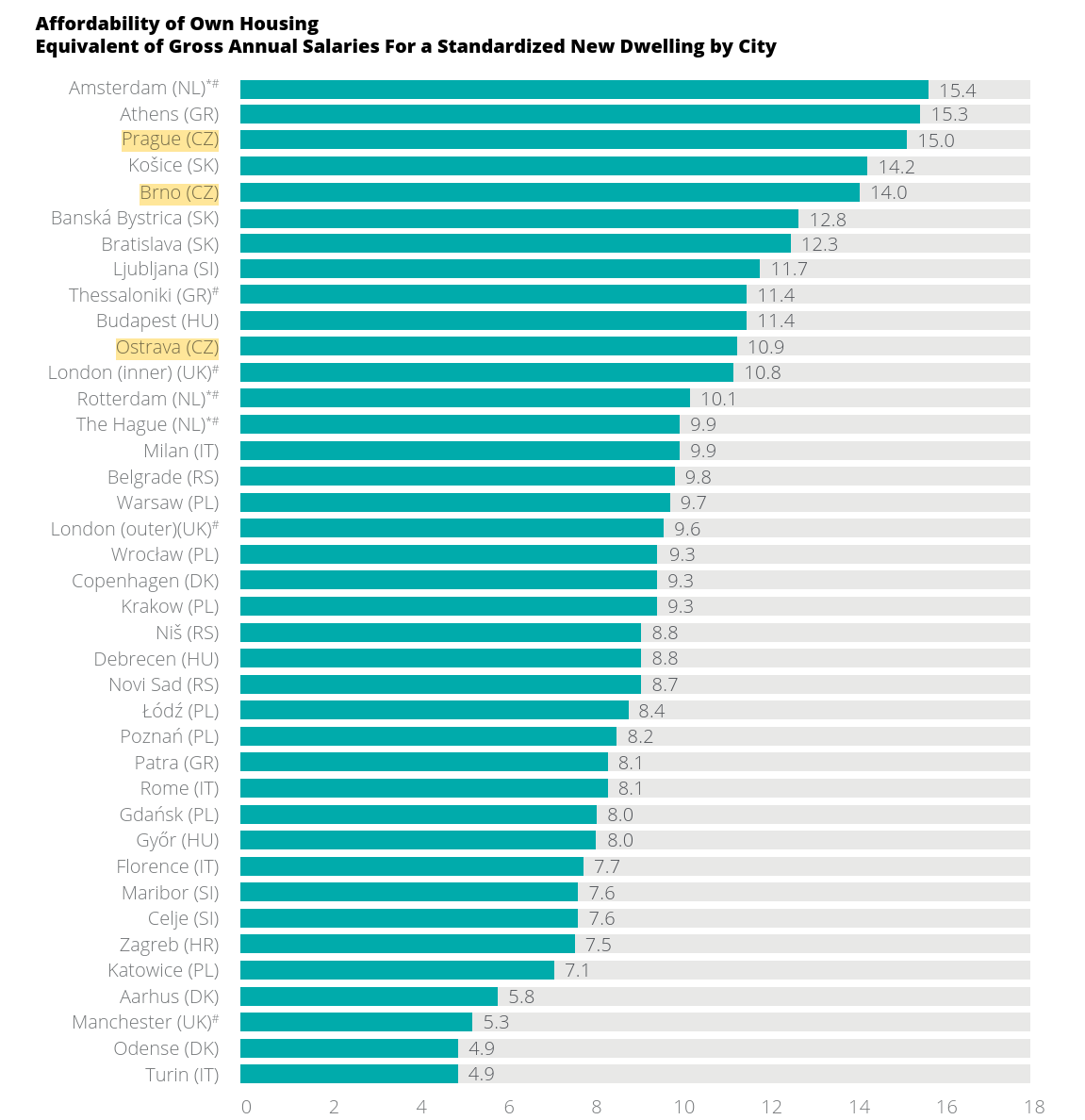 Za nízké nelze rozhodně považovat ani ceny na českém realitním trhu, který vůči příjmům patří mezi nejdražší v Evropě. Dokládá to studie Deloitte, podle níž lze nový byt v Praze pořídit za 15násobek průměrné roční hrubé mzdy. Dražší vůči příjmům jsou byty pouze v Amsterdamu a Athénách. Naopak například ve Varšavě lze nový byt pořídit relativně o přibližně třetinu levněji.